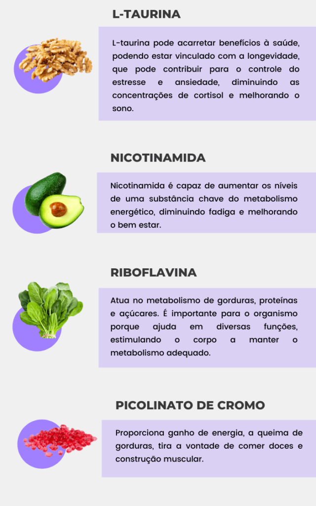 Composição: Óxido de magnésio, L-Taurina, Espirulina, Nicotinamida, D-Pantotenato de cálcio, Cloridrato de piridoxina, Riboflavina, Tiamina Mononitrato, Picolinato de Cromo, Ácido N-pteroil-L-glutâmico, D-Biotina, Metilcobalamina, estabilizantes goma guar polidextrose e polivinilpirrolidona, antiumectantes estearato de magnésio e dióxido de silício.